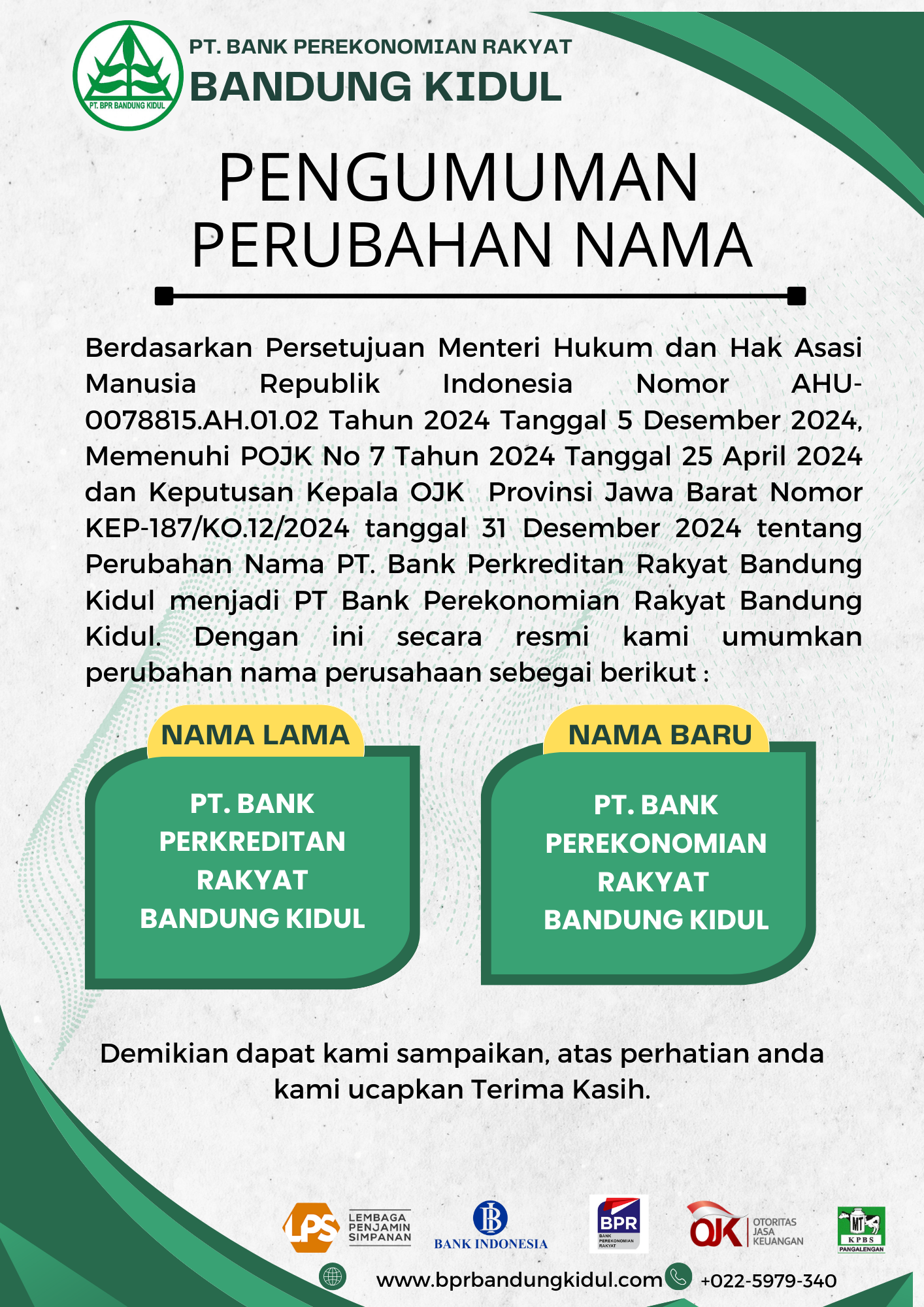 Dengan ini kami sampaikan bahwa Berdasarkan Persetujuan Menteri Hukum dan Hak Asasi Manusia RI No AHU-0078815.AH.01.02 Tahun 2024 Tanggal 05 Desember 2024 dan Keputusan Kepala OJK Regional Jawa Barat No KEP-187/KO.12/2024 Tanggal 31 Desember 2024 tentang Perubahan nama semula PT. Bank Perkreditan Rakyat Bandung Kidul menjadi PT. Bank Perekonomian Rakyat Bandung Kidul secara resmi.
